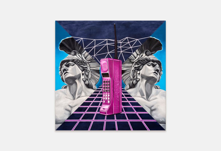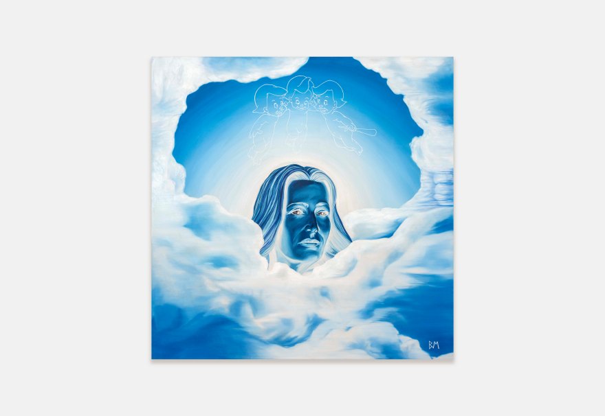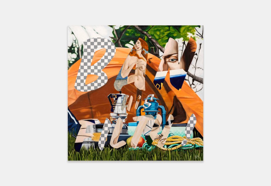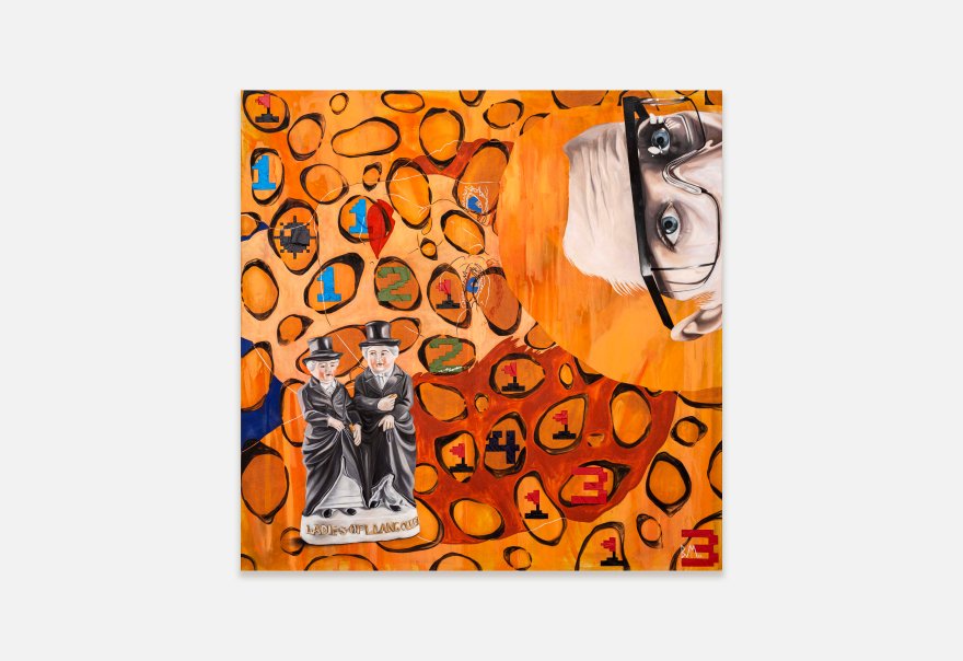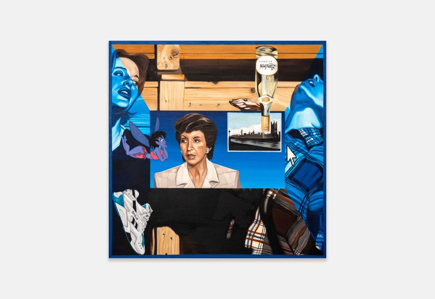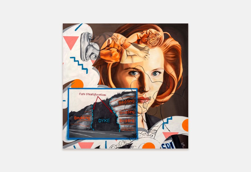Seemingly at odds with her contemporary subject matter, Massey’s virtuosic brushwork emulates the precision of the Old Masters and her practice is rooted in traditional making techniques. She uses collage, mixed media and optical illusion to create multi-layered narratives through each piece, with some also making subtle yet insightful references to art history. In Plus One (2022), for example, Massey has employed a ‘cut-out’ style redolent of surrealist artist René Magritte, delineating the outline of the figures found in Cupid Wounding Sappho, a drawing by Victorian sculptor John Gibson (bequeathed to the RA Collection in 1866) who was known to channel same-sex passions into his works. Similarly, in ‘Jose Chung’s from outer space’ (2021), Massey pays homage to the esteemed and openly homosexual Florentine painter Sandro Botticelli and his The Birth Of Venus (mid-1480s). Bringing together the past, the peculiar and the personal, Massey’s works meticulously examine the relevance and role of painting as a vehicle for communication and change in the face of popular culture.